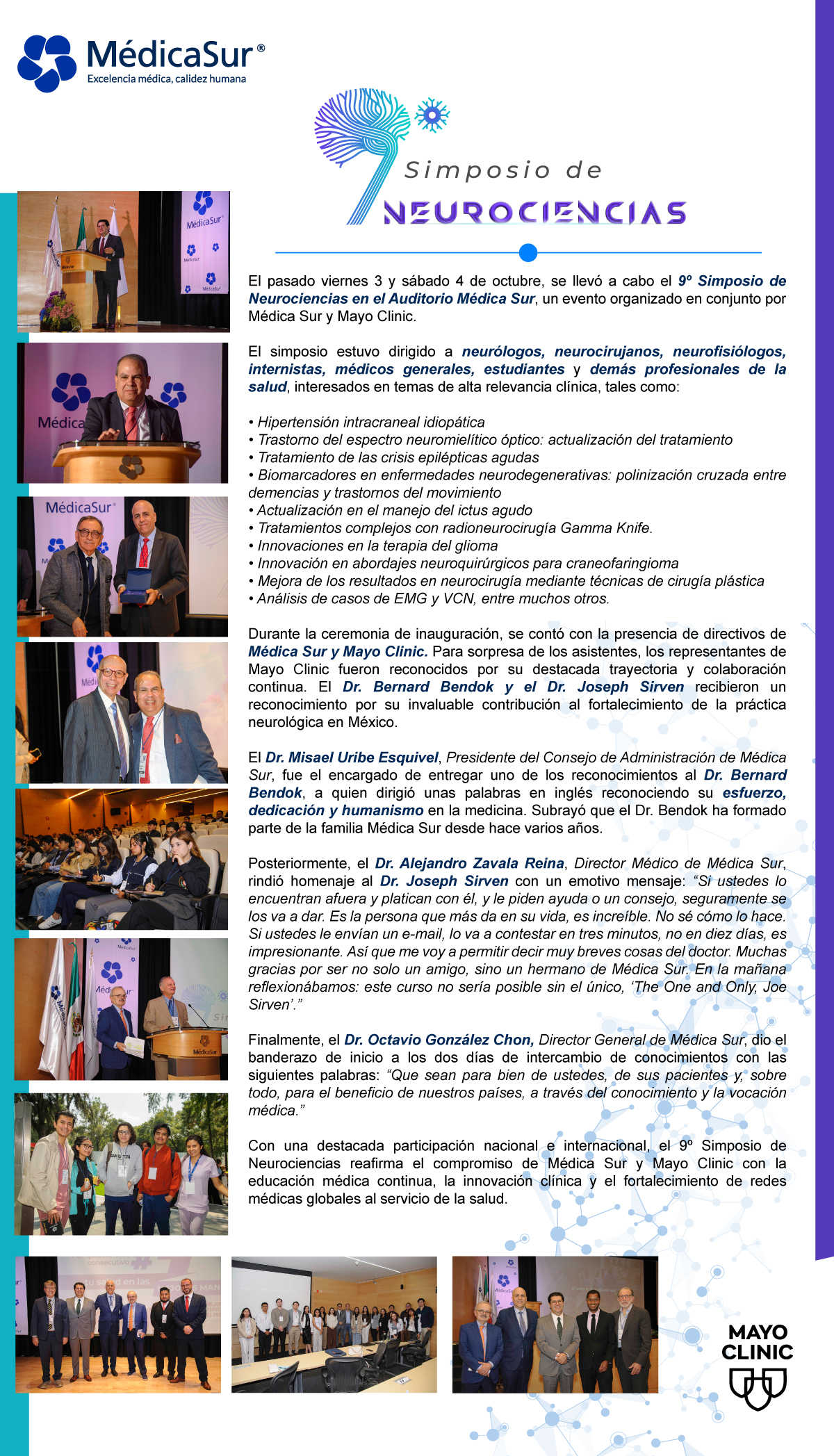 Lecciones aprendidas en 9 años del Simposio de neurociencias de Médica Sur y Mayo Clinic. Dr. Bernard Bendok Dr. Alejandro Zavala |